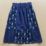 Linen blend + cotton ikat skirt with elastic waist, pockets, and a slight A-line silhouette. Intended to sit at natural waist (at or above belly button). Front and back are pieced.